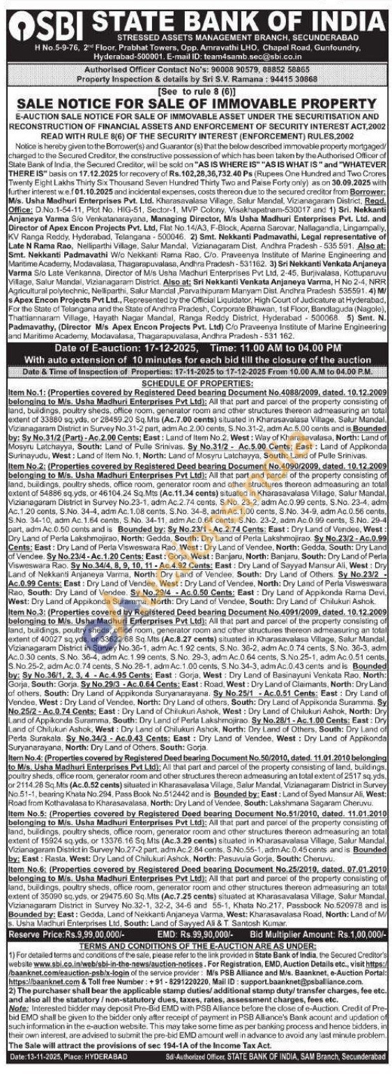 Item No.1: (Properties covered by Registered Deed bearing Document No.4088/2009, dated, 10.12.2009 belonging to M/s. Usha Madhuri Enterprises Pvt Ltd): All that part and parcel of the property consisting of land, builidings, poultry sheds, office room, generator room and other structures thereon admeasuring an total extent of 33880 sq.yds, or 28459.20 Sq.Mis (Ac.7.00 cents) situated in Kharasavalasa Village, Salur Mandal, Vizianagaram District in Survey No.31-2 part, adm Ac.2.00 cents, S.No.31-2, adm Ac.5.00 cents and is Bounded by: Sy No.31/2 (Part)-Ac.2.00 Cents: East: Land of Item No.2, West: Way of Kharasavalasa, North: Land of Mosyru Latchayya, South: Land of Pulle Srinivas. Sy No.31/2 Ac.5.00 Cents: East: Land of Appikonda Surinayudu, West: Land of Item No. 1, North: Land of Mosyru Latchayya, South: Land of Pulle Srinivas. Item No.2: (Properties covered by Registered Deed bearing Document No.4090/2009, dated. 10.12.2009 belonging to M/s. Usha Madhuri Enterprises Pvt Ltd): All that part and parcel of the property consisting of land, buildings, poultry sheds, office room, generator room and other structures thereon admeasuring an total extent of 54886 sq.yds, or 46 104.24 Sq.Mts (Ac.11.34 cents) situated in Kharasavalasa Village, Salur Mandal, Vizianagaram District in Survey No.23-1, adm Ac.2.74 cents, S.No. 23-2, adm Ac.0.99 cents. S.No. 23-4, adm Ac. 1.20 cents, S.No. 34-4, adm Ac. 1.08 cents, S.No. 34-8, adm Ac. 1.00 cents, S.No. 34-9, adm Ac. 0.56 cents. S.No. 34-10, adm Ac. 1.64 cents, S.No. 34-11, adm Ac.0.64 cents, S.No. 23-2, adm Ac.0.99 cents, S.No. 29-4 part, adm Ac.0.50 cents and is Bounded by: Sy No.23/1-Ac.2.74 Cents: East: Dry Land of Vendee, West: Dry Land of Perla Lakshmojirao, North: Gedda, South: Dry Land of Perla Lakshmojirao. Sy No.23/2-Ac.0.99 Cents: East: Dry Land of Perla Visweswara Rao, West: Dry Land of Vendee, North: Gedda, South: Dry Land of Vendee. Sy No.23/4-Ac.1.20 Cents: East: Gorja, West: Banjaru, North: Banjaru, South: Dry Land of Perla Visweswara Rao. Sy No.34/4, 8, 9, 10, 11-Ac.4.92 Cents: East: Dry Land of Sayyad Mansur All, West: Dry Land of Nekkanti Anjaneya Varma, North: Dry Land of Vendee, South: Dry Land of Others. Sy No.23/2 Ac.0.99 Cents: East: Dry Land of Vendee, West: Dry Land of Vendee, North: Dry Land of Perla Visweswara Rao, South: Dry Land of Vendee. Sy No.29/4 Ac.0.50 Cents: East: Dry Land of Appikonda Rama Devi, West: Dry Land of Appikonda Suramma, North: Dry Land of Vendee, South: Dry Land of Chilukuni Ashok. Item No.3: (Properties covered by Registered Deed bearing Document No. 4091/2009, dated. 10.12.2009 belonging to M/s. Usha Madhuri Enterprises Pvt Ltd): All that part and parcel of the property consisting of land, buildings, poultry sheds, office room, generator room and other structures thereon admeasuring an total extent of 40027 sq.yds, or 33622.68 Sq.Mts (Ac.8.27 cents) situated in Kharasavalasa Village, Salur Mandal, Vizianagaram District in Survey No.36-1, adm Ac. 1.92 cents, S.No. 36-2, adm Ac.0.74 cents, S.No. 36-3, adm Ac.0.30 cents. S.No. 36-4, adm Ac. 1.99 cents, S.No. 29-3, adm Ac.0.64 cents, S.No.25-1, adm Ac 0.51 cents, S.No.25-2, adm Ac.0.74 cents, S.No. 28-1, adm Ac. 1.00 cents, S.No. 34-3, adm Ac.0.43 cents and is Bounded by: Sy No.36/1, 2, 3, 4-Ac.4.95 Cents: East: Gorja, West: Dry Land of Basinayuni Venkata Rao, North: Gorja, South: Gorja. Sy No.29/3-Ac.0.64 Cents: East: Road, West: Dry Land of Claimants, North: Dry Land of others, South: Dry Land of Appikonda Suryanarayana. Sy No.25/1 Ac.0.51 Cents: East: Dry Land of Vendee, West: Dry Land of Vendee, North: Dry Land of others, South: Dry Land of Appikonda Suramma. Sy No.25/2-Ac.0.74 Cents: East: Dry Land of Chilukun Ashok, West: Dry Land of Chilukuri Ashok, North: Dry Land of Appikonda Suramma, South: Dry Land of Perla Lakshmojirao. Sy No.28/1-Ac. 1.00 Cents: East: Dry Land of Chilukuri Ashok, West: Dry Land of Chilukuri Ashok, North: Dry Land of Others, South: Dry Land of Perla Surakala. Sy No.34/3-Ac.0.43 Cents: East: Dry Land of Vendee, West: Dry Land of Appikonda Suryanarayana, North: Dry Land of Others, South: Gorja. Item No.4: (Properties covered by Registered Deed bearing Document No.50/2010, dated. 11.01.2010 belonging to Mis. Usha Madhuri Enterprises Pvt Ltd): All that part and parcel of the property consisting of land, buildings. poultry sheds, office room, generator room and other structures thereon admeasuring an total extent of 2517 sq.yds. or 2114.28 Sq.Mts (Ac.0.52 cents) situated in Kharasavalasa Village, Salur Mandal, Vizianagaram District in Survey No.51-1, bearing Knata No.294, Pass Book No.512442 and is Bounded by: East: Land of Syed Mansur Ali, West: Road from Kothavalasa to Kharasavalasa, North: Dry Land of Vendee, South: Lakshmana Sagaram Cheruvu. Item No.5: (Properties covered by Registered Deed bearing Document No.51/2010, dated. 11.01.2010 belonging to Mis. Usha Madhuri Enterprises Pvt Ltd): All that part and parcel of the property consisting of land, builidings, poultry sheds, office room, generator room and other structures thereon admeasuring an total extent of 15924 sq.yds, or 13376.16 Sq. Mis (Ac.3.29 cents) situated in Kharasavalasa Village, Salur Mandal, Vizianagaram District in Survey No.27-2 part, adm Ac.2.84 cents, S.No.55-1, adm Ac 0.45 cents and is Bounded by: East: Rasta, West: Dry Land of Chilukuri Ashok, North: Pasuvula Gorja, South: Cheruvu. Item No.6: (Properties covered by Registered Deed bearing Document No.25/2010, dated, 07.01.2010 belonging to M/s. Usha Madhuri Enterprises Pvt Ltd): All that part and parcel of the property consisting of land, buildings, poultry sheds, office room, generator room and other structures thereon admeasuring an total extent of 35090 sq.yds, or 29475.60 Sq. Mts (Ac.7.25 cents) situated at Kharasavalasa Village, Salur Mandal, Vizianagaram District in Survey No.32-1, 32-2, 34-6 and 55-1, Khata No.217, Passbook No.520978 and is Bounded by: East: Gedda, Land of Nekkanti Anjaneya Varma, We