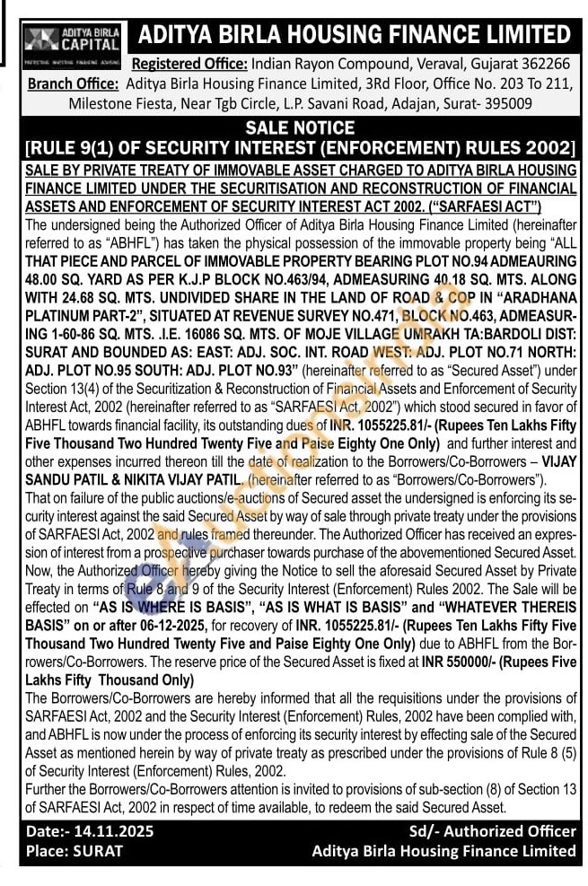 "ALL THAT PIECE AND PARCEL OF IMMOVABLE PROPERTY BEARING PLOT NO.94 ADMEAURING 48.00 SQ. YARD AS PER K.J.P BLOCK NO.463/94, ADMEASURING 40.18 SQ. MTS. ALONG WITH 24.68 SQ. MTS. UNDIVIDED SHARE IN THE LAND OF ROAD & COP IN "ARADHANA PLATINUM PART-2", SITUATED AT REVENUE SURVEY NO.471, BLOCK NO.463, ADMEASUR-ING 1-60-86 SQ. MTS. .I.E. 16086 SQ. MTS. OF MOJE VILLAGE UMRAKΗ ΤΑ: BARDOLI DIST: SURAT AND BOUNDED AS: EAST: ADJ. SOC. INT. ROAD WEST: ADJ. PLOT NO.71 NORTH: ADJ. PLOT NO.95 SOUTH: ADJ. PLOT NO.93
