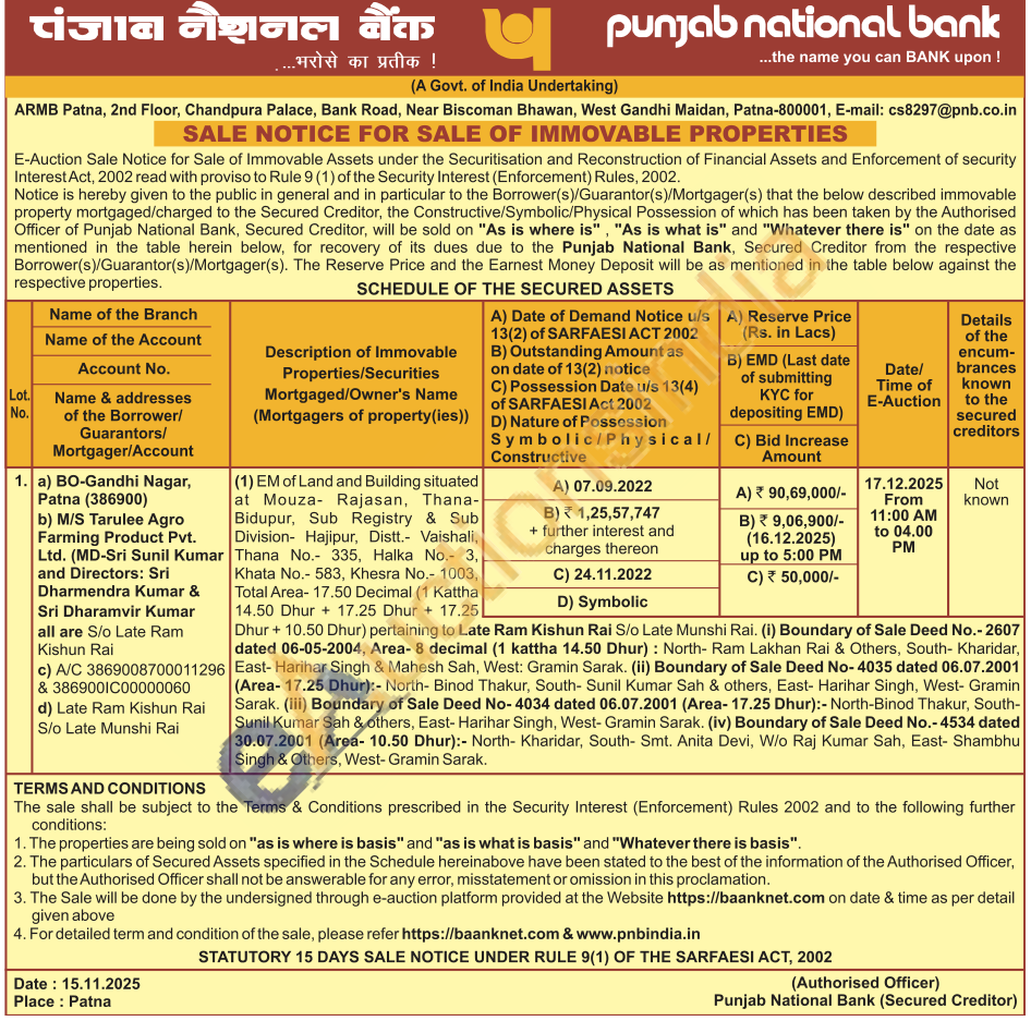 1) EM of Land and Building situated at Mouza- Rajasan, Thana- Bidupur, Sub Registry & Sub Division- Hajipur, Distt. Vaishali Thana No. 335, Halka No. 3, Khata No.- 583, Khesra No.- 1003, Total Area-17.50 Decimal (1 Kattha 14.50 Dhur + 17.25 Dhur + 17.25 Dhur + 10.50 Dhur) pertaining to Late Ram Kishun Rai S/o Late Munshi Rai. (i) Boundary of Sale Deed No.- 2607 dated 06-05-2004, Area- 8 decimal (1 kattha 14.50 Dhur): North- Ram Lakhan Rai & Others, South- Kharidar, East-Harihar Singh & Mahesh Sah, West: Gramin Sarak. (ii) Boundary of Sale Deed No-4035 dated 06.07.2001 (Area- 17.25 Dhur):- North- Binod Thakur, South- Sunil Kumar Sah & others, East- Harihar Singh, West- Gramin Sarak. (iii) Boundary of Sale Deed No-4034 dated 06.07.2001 (Area-17.25 Dhur):- North-Binod Thakur, South-Sunil Kumar Sah & others, East- Harihar Singh, West- Gramin Sarak. (iv) Boundary of Sale Deed No.-4534 dated 30.07.2001 (Area- 10.50 Dhur):- North- Kharidar, South- Smt. Anita Devi, W/o Raj Kumar Sah, East- Shambhu Singh & Others, West- Gramin Sarak