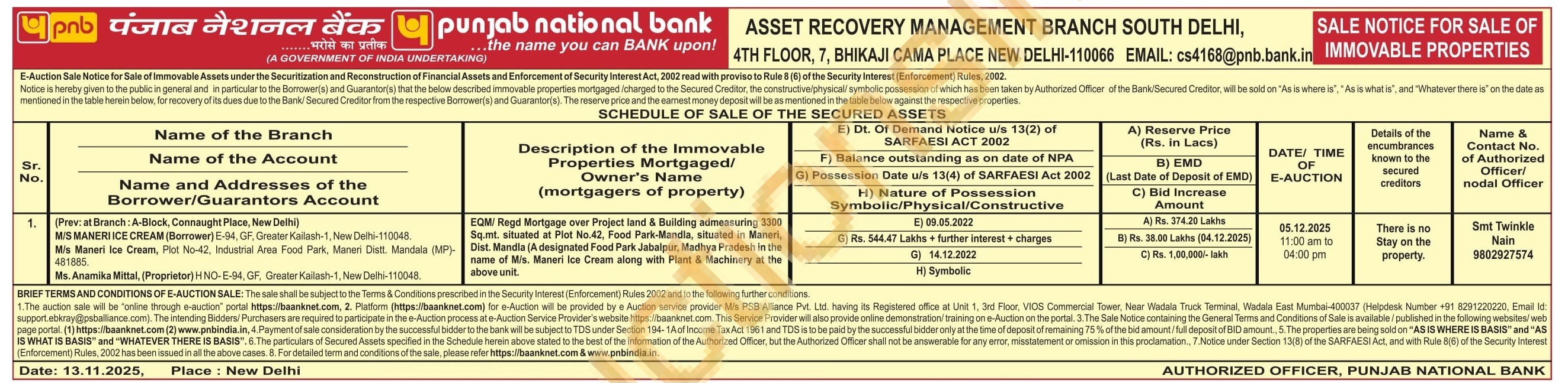EQMI Regd Mortgage over Project land & Building adineasuring 3300 Squret, situatat at Plot No. 42, Food Park-Mandia, situated in Mana Oil Mandle (A designated Food Park Jabalpur, Madhya Pradesh in the nose of Mis. Manan ice Cream along with Plant & Machinery at the above unit.