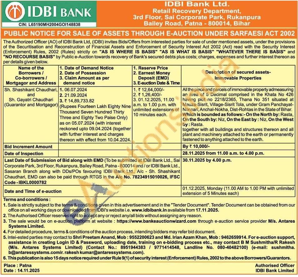 All the piece and parcels of immovable property admeasuring an area of 5 Decimal comprised in the Khata No 426 having plot no 2218/2365, Thana No 351 situated at Mauza-Sisrit, Village-Sisrit Tola, under Gram Panchayat- Nonsari, Anchal-Nokha, Dist-Rohtas in the State of Bihar. Which is bounded as follows:- On the North by: Rasta, On the South by: Niz, On the East by: Niz, On the West by: Rasta.