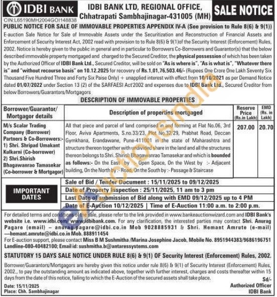 All that piece and parcel of land comprised in and forming at Flat No.06, 3rd Floor, Aviva Apartments, S.no.33/23, Plot No.32/29, Prabhat Road, Deccan Gymkhana, Erandawane, Pune-411001 in the state of Maharashtra and structure thereon together with undivided share in the land and all the structures thereon belongs to Shri. Shirish Bhagawanrao Tamasekar and which is bounded as follows:- On the East by Open Space, On the West by Adjacent building, On the North by:- Road, On the South by:- Passage & Staircase
