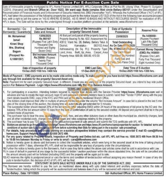 All that part and parcel of the property bearing Property Bearing Ts No. 622. Assessment No 43612, Ward No. 28. Bellary Bellary Teluk & District Karnataka-583102 Area Admeasuring (le Sq. FL) Property Type: Land Area Built Up Area, Carpet, Anea Property Area: 600.00, 600.00, 470.00