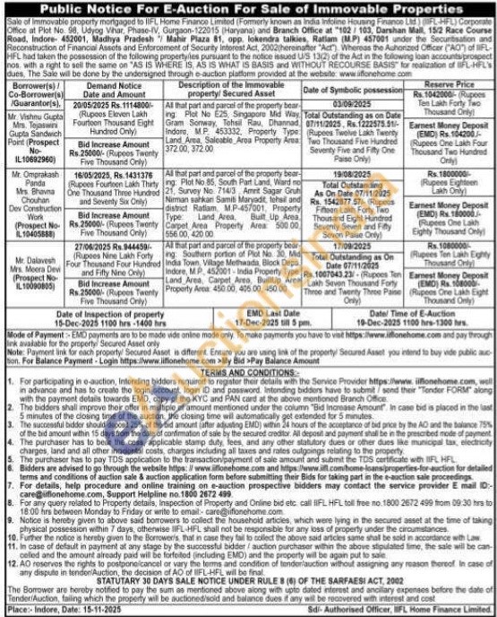 At that part and parcel of the property bear-ing: Plot No E25, Singapore Mid Way Gram Sorway, Tehsil Rau, Dhannad, Indore, M.P. 453332, Property Type Land Area, Saleable Area Property Area 372.00, 372.00