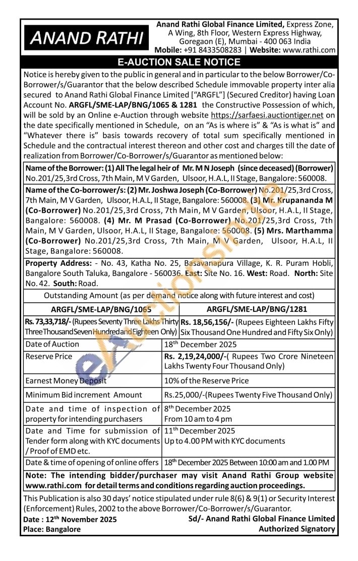 Property Address: No. 43, Katha No. 25, Basavanapura Village, K. R. Puram Hobli, Bangalore South Taluka, Bangalore - 560036. East: Site No. 16. West: Road. North: Site No. 42. South: Road.