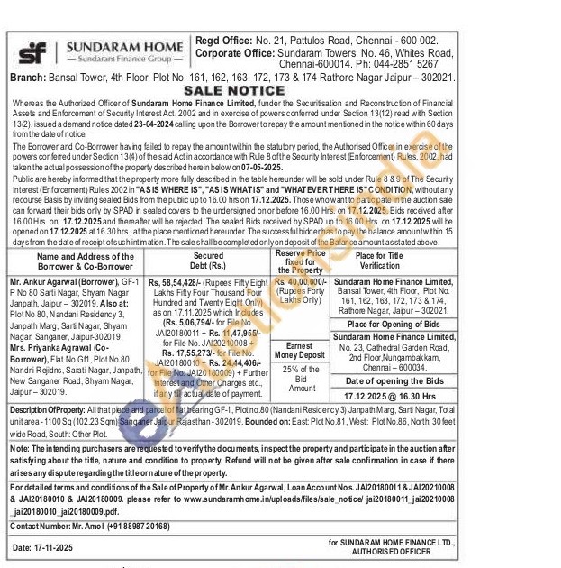 Description Of Property: All that piece and parcel of flat bearing GF-1, Plot no.80 (Nandani Residency 3) Janpath Marg, Sarti Nagar, Total unit area-1100 Sq (102.23 Sqm) Sanganer Jaipur Rajasthan-302019. Bounded on: East: Plot No.81, West: Plat No.86, North: 30 feet wide Road, South: Other Plot