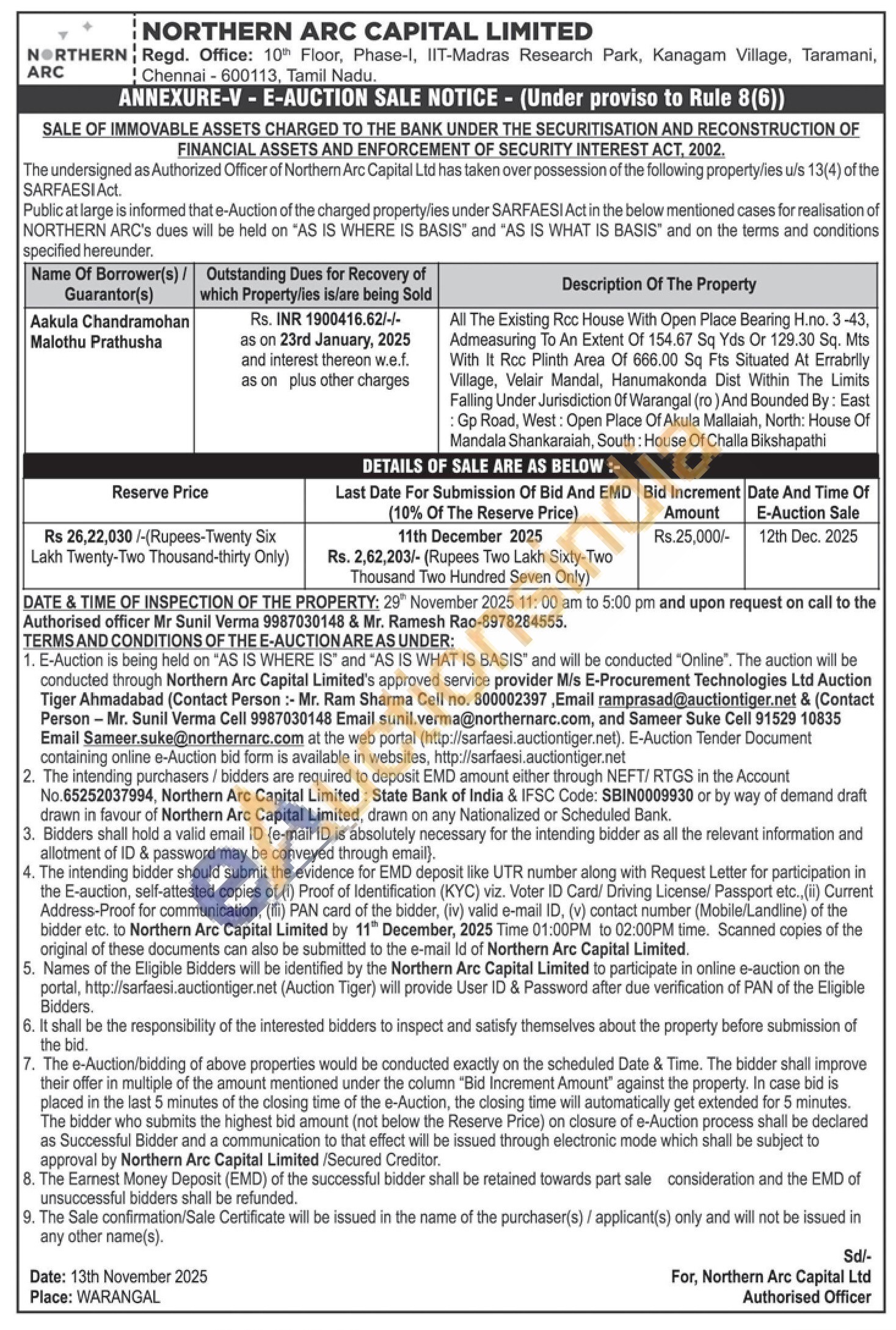 Authorised officer Mr Sunil Verma 9987030148 & Mr. Ramesh Rao-8978284555