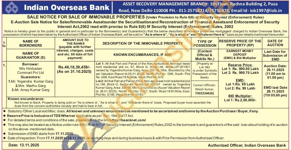 Lot 1: All that Part and Parcel of the Non-Agricultural Non-agri lease hold residential plot no. 97, Block G, Sector-44, Noida, UP-251001 owned by Yogendra Kumar Garg. Area: 300 Sq. Mtrs. Bounded by (As per Valuation Report dt.26.01.2025): North-Plot No. G96, South-Plot No. G98, East Road 18 M Wide, West: Plot No. G76