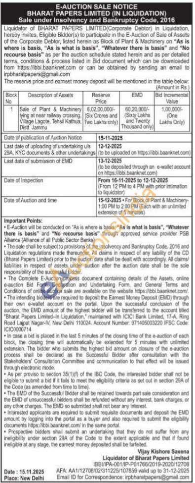 Sale of Plant & Machinery lying at near railway crossing. Village Lagote, Tehsil Kathua, Distt. Jammu