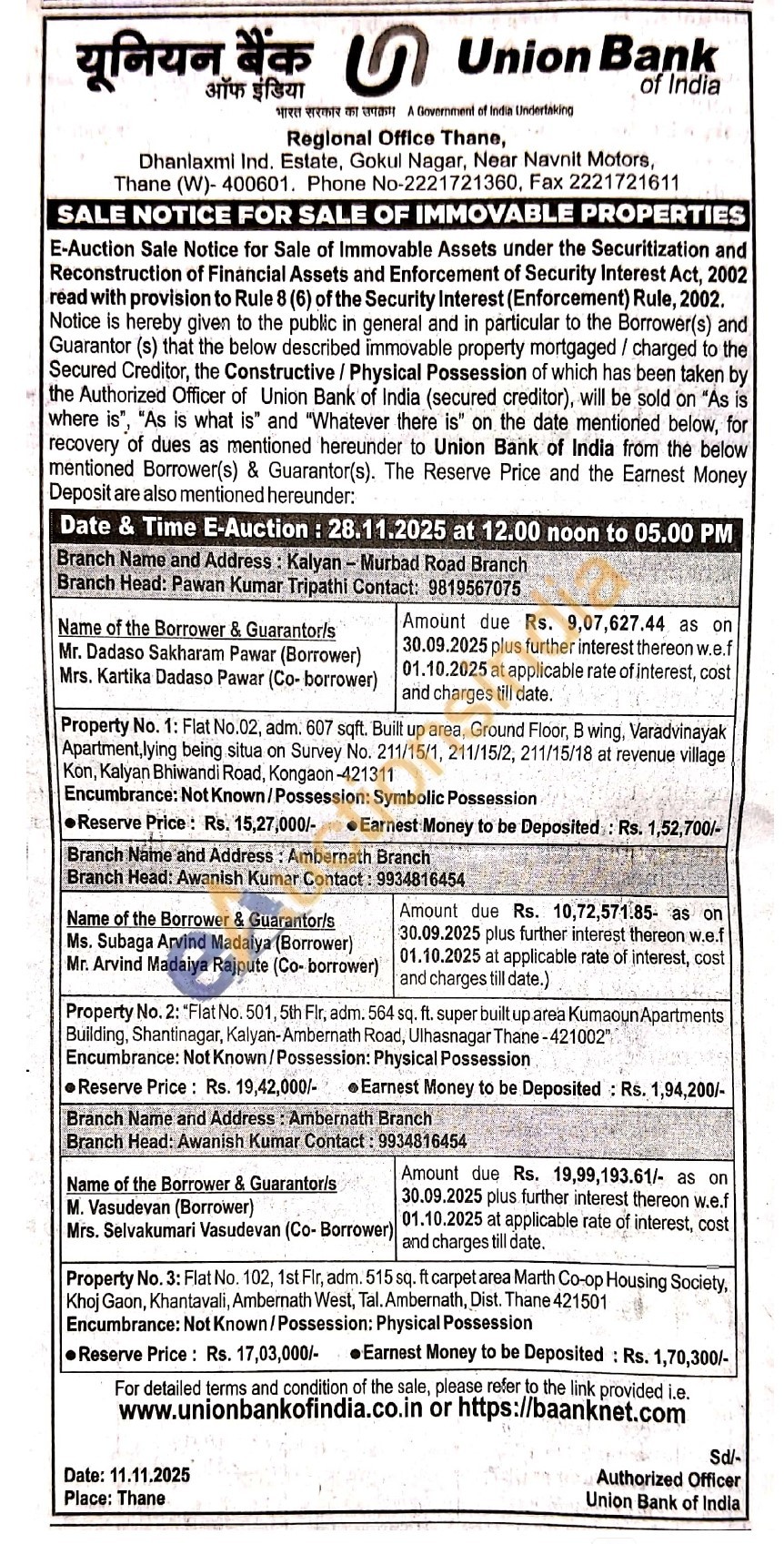 Property No. 2: "Flat No. 501, 5th Flr, adm. 564 sq. ft. super built up area Kumaoun Apartments Building, Shantinagar, Kalyan-Ambernath Road, Ulhasnagar Thane-421002" Encumbrance: Not Known/Possession: Physical Possession