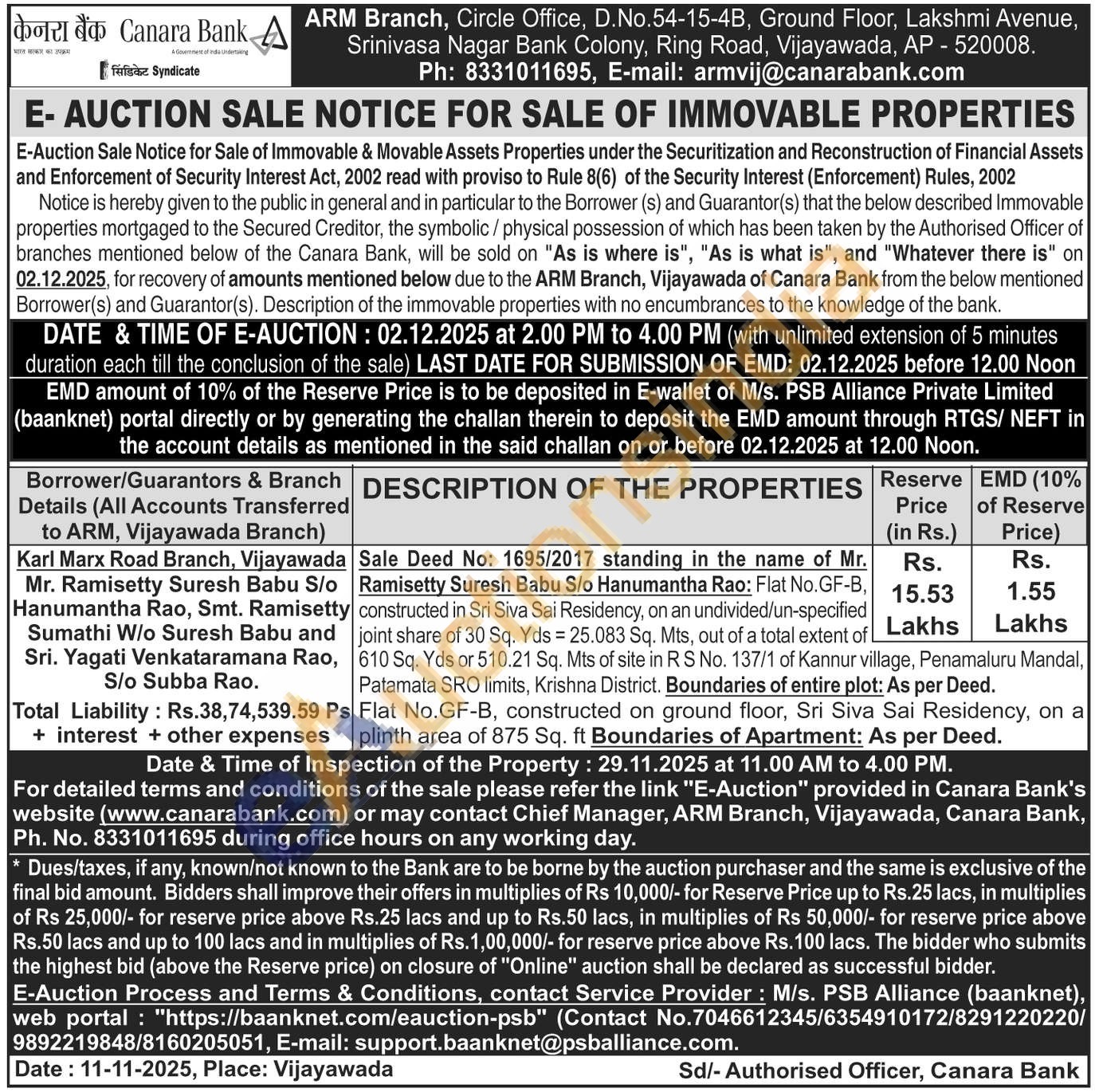 Sale Deed No: 1695/2017 standing in the name of Mr Ramisetty Suresh Babu S/o Hanumantha Rao: Flat No.GF-B, constructed in Sri Siva Sai Residency, on an undivided/un-specified joint share of 30 Sq. Yds = 25.083 Sq. Mts, out of a total extent of 610 Sq. Yds or 510.21 Sq. Mts of site in RS No. 137/1 of Kannur village, Penamaluru Mandal, Patamata SRO limits, Krishna District. Boundaries of entire plot: As per Deed. Flat No. GF-B, constructed on ground floor, Sri Siva Sai Residency, on a plinth area of 875 Sq. ft Boundaries of Apartment: As per Deed