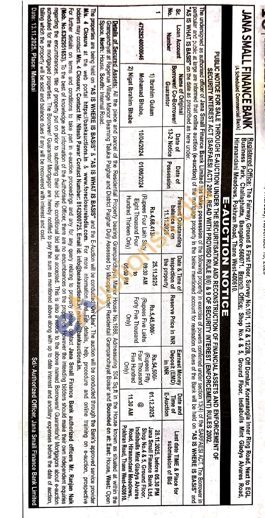 Details of Secured Assets: All the piece and parcel of the Residential Property bearing Grampanchayat Manor House No.1686, Admeasuring 504 Sq.ft in the House known as situated at within the Grampanchyat at Regenue Village Manor Bearning Taluka Palghar and District Palghar Duly Assessed by Muncipal Under Residentail Grampanchayat Boisar and Bounded on at: East: House, West: Open Space, North: House, South: Internal Road