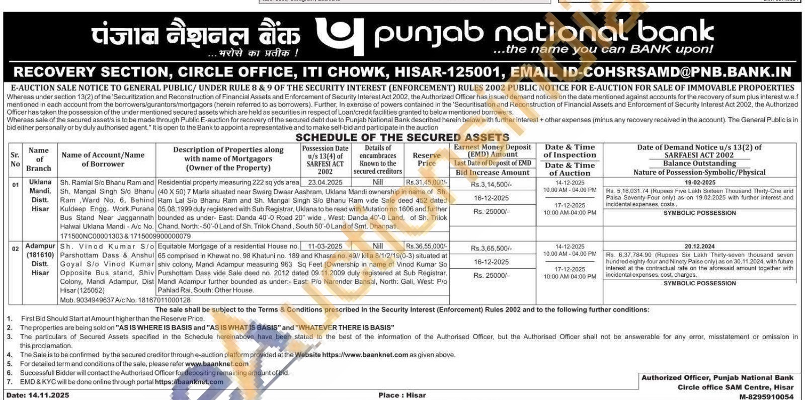 Equitable Mortgage of a residential House no. Nill 65 comprised in Khewat no. 98 Khatuni no. 189 and Khasra no. 49// killa 8/1/2/19(0-3) situated at shiv colony, Mandi Adampur measuring 963 Sq Feet [Ownership in name of Vinod Kumar So Shiv Purshottam Dass vide Sale deed no. 2012 dated 09.11.2009 duly registered at Sub Registrar, Dist Mandi Adampur further bounded as under.- East: P/o Narender Bansal, North: Gali, West: P/o Pahlad Rai, South: Other House.