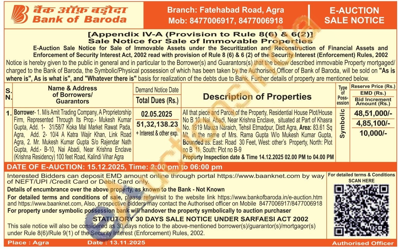 All that piece and Parcel of the Property, Residential House Plot/House No B 10, Nai Abadi, Near Krishna Enclave, situated at Part of Khasra No. 1919 Mauza Naraich, Tehsil Etmadpur, Distt Agra, Area: 83.61 Sq Mt, in the name of Mrs. Rama Gupta W/o Mukesh Kumar Gupta, Bounded as: East: Road 30 Feet, West: other's Property, North: Plot no B 11, South: Plot no B-9