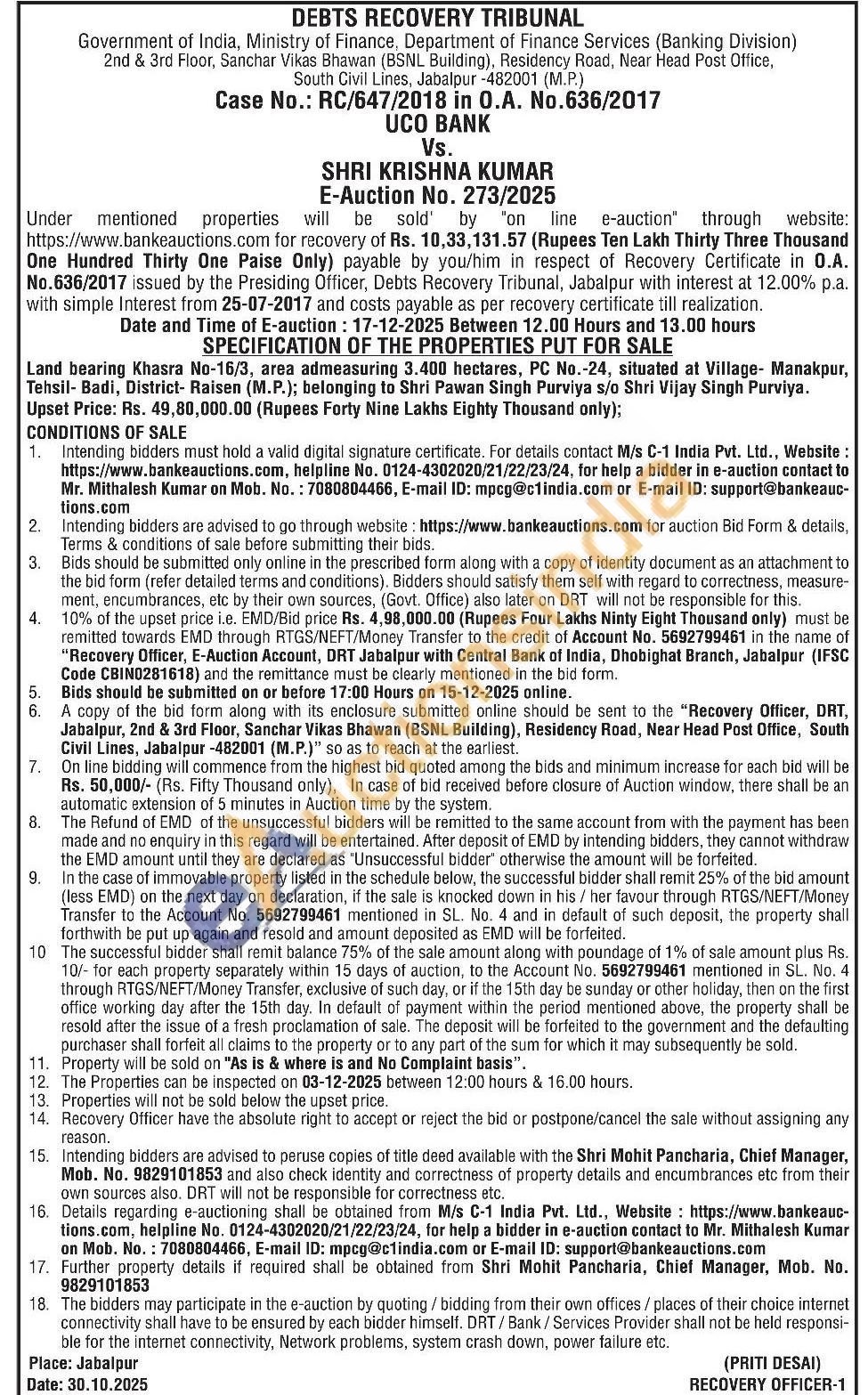 Land bearing Khasra No-16/3, area admeasuring 3.400 hectares, PC No.-24, situated at Village Manakpur, Tehsil-Badi, District- Raisen (M.P.); belonging to Shri Pawan Singh Purviya s/o Shri Vijay Singh Purviya.