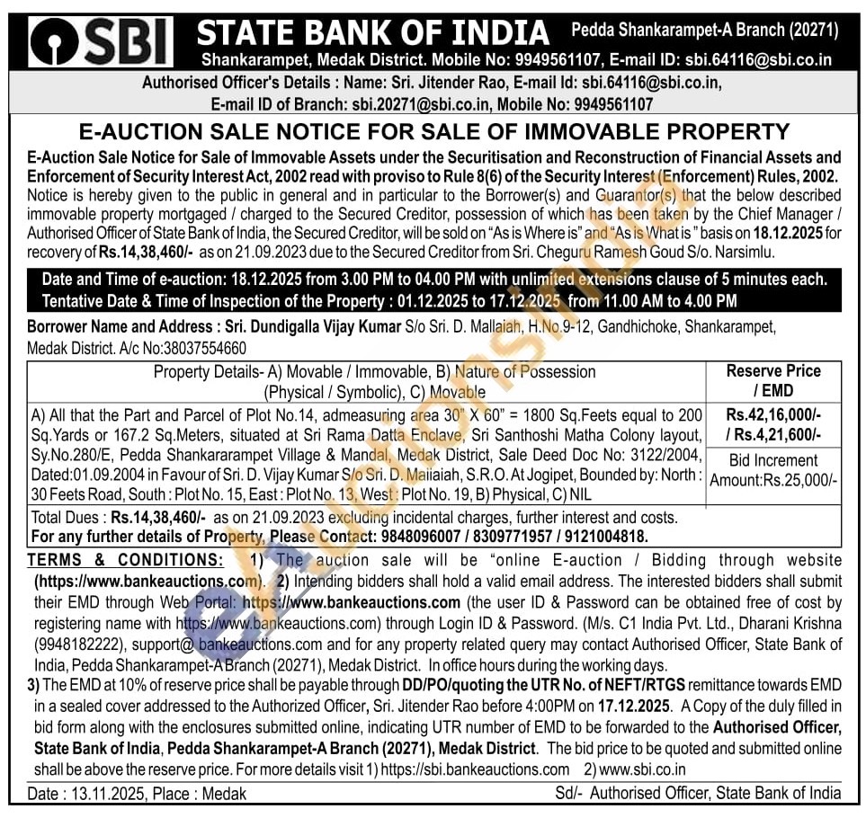 A) All that the Part and Parcel of Plot No.14, admeasuring area 30" X 60" = 1800 Sq. Feets equal to 200 Sq. Yards or 167.2 Sq.Meters, situated at Sri Rama Datta Enclave, Sri Santhoshi Matha Colony layout, Sy.No.280/E, Pedda Shankararampet Village & Mandal, Medak District, Sale Deed Doc No: 3122/2004, Dated: 01.09.2004 in Favour of Sri. D. Vijay Kumar S/o Sri. D. Maiiaiah, S.R.O. At Jogipet, Bounded by: North: 30 Feets Road, South: Plot No. 15, East: Plot No. 13, West: Plot No. 19, B) Physical, C) NIL