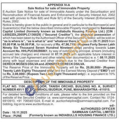 FLAT NO. 1106, 11TH FLOOR, TANISH ORCHID, BUILDING NO. K, SURVEY NUMBER 491/1 TO 7, CHARHOLI BUDRUK, PUNE, MAHARASHTRA-411015.