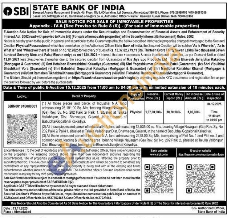 (1) All those pieces and parcel of Industrial N.A. land admeasuring 26, 191.00 Sq. Mts, bearing Village Navagam (Ga) Rev. Sy. No. 202 Paiki 2/ Paiki 1, situated at Taluka Vallabhipur, Dist. Bhavnagar, Gujarat, in the name of Babubhai Gopalbhai Kakadiya.(2) All those pieces and parcel of Industrial N.A. land admeasuring 12,535.00 sq. Mts. bearing Village Navagam (Ga) Rev. Sy. No. 202 Paiki 2/ Paiki 1, situated at Taluka Vallabhipur Dist. Bhavnagar, Gujarat, in the name of Babubhai Gopalbhai Kakadiya. (3) All those piece and parcel of Industrial N.A. land admeasuring 2428.00 Sq. Mts. (comprising of Plot No. 1 and Plot no. 2 and common road, loading & un-loading area bearing Village Navagam (Ga) Rev. Sy. No. 202 Paiki 2, situated at Taluka Vallbhipur,