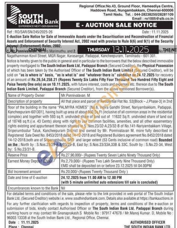 All that piece and parcel of Residential Flat No. S3[Block-J.Phase-3] in 2nd floor of the building in the name "PALMYRA HOMES [No.6. Indira Gandhi Street, Nariyambakkam, Padappai, Kancheepuram-601301], having built up area of about 930 Sq.Ft (inclusive of all common areas in the residential complex) and together with 593 sq.ft. undivided share of land out of 11632 Sq.ft. undivided share of land out of 18748 sq.ft. (ie. 43 Cents) along with right to use common facilities, amenities, and all other easementary rights existing and appurtenant thereon situated in S.Nos.23/32-A,23/32-B of No.141-Nariyambakkam Village, Sriperumbudur Taluk, Kancheepuram District and owned by Mr. Ponnivalavan M. more fully described in Registered Sale Deed No. 8453/2018 dated 14-12-2018 and Registered Builders agreement No.8452/2018 dated 14-12-2018,both are of Sriperumbudur SRO and larger extent (53 Cents inclusive of common road) Bounded on the North by: S.Nos.23/29-A & 23/29-B, East by: S.Nos. 23/33A 33B & 33C, South by: S.No.23-34, West by: S.No.23/31-B.