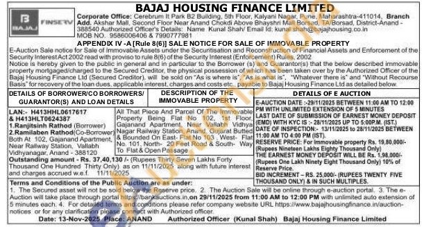 All That Piece And Parcel Of The Immovable Property Being Flat No 102. 1st Floor Gajanand Apartment, Near Vallabh Vidhya Nagar Railway Station, Anand, Gujarat Butted & Bounded On East- Flat No 103 West No. 101, North 20 Feet Road & South To Flat & Open Passage Flat Way