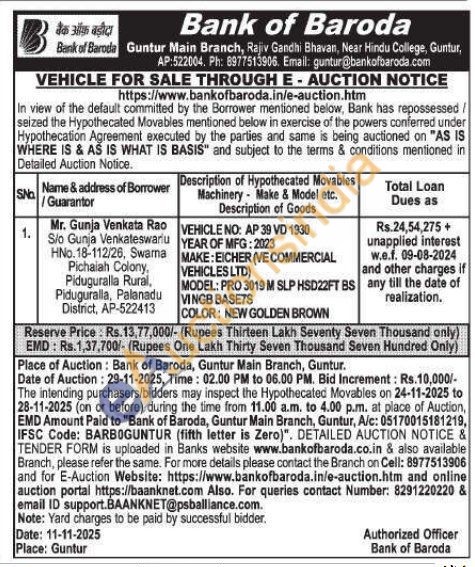 VEHICLE NO: AP 39 VD 1930 YEAR OF MFG: 2023 MAKE: EICHER (VE COMMERCIAL VEHICLES LTD) MODEL: PRO 3019M SLP HSD22FT BS VINGB BASETS COLOR: NEW GOLDEN BROWN