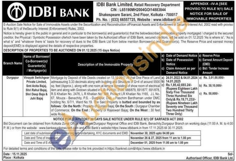 Mortgage by Deposit of title Deeds created on 13.12.2017 All that One Piece of Land admeasuring 3.33 decimals along with building and Structure of G+4 of around 5500 sq. feet (Approx.), along with one room at terrace consisting of show room of electrical item and along with Godown situated in L.R. Plot No. 2135, 688/879, 691/877, 691/878, R.S Khatian No. 2476, L.R Khatian No. 309, Present LR Khatian No. 1165, J.L No. 67, Mouza Benachity, P.S. Durgapur, Dist.-Paschim Bardhaman under DMC holding No. 6/7/1, Ward No. 19. The Said Property is butted and bounded by as follows: On the North: Property of Gunjan Bajaj On the South: Durgapur Chamber of Commerce. On the East: Property of Rajeswari Bajaj, On the West: 30 feet wide Road