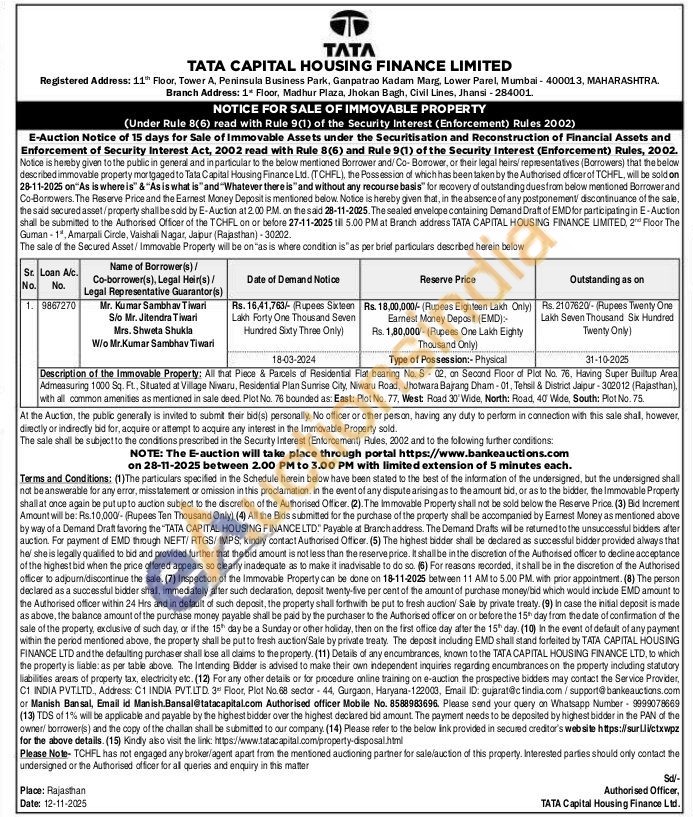 Description of the Immovable Property: All that Piece & Parcels of Residential Flat bearing No. S-02, on Secand Floor of Plot No. 76, Having Super Builtup Area Admeasuring 1000 Sq. Ft., Situated at Village Niwaru, Residential Plan Sunrise City, Niwaru Road, Jhotwara Bajrang Dham-01, Tehsil & District Jaipur-302012 (Rajasthan). with all common amenities as mentioned in sale deed. Plot No. 76 bounded as. East: Plot No. 77, West: Road 30' Wide, North: Road, 40 Wide, South: Plot No. 75.