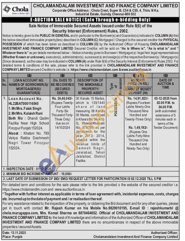 00 Kanals 15 Marias, which is 135/1440 share of land measuring 08 Kanals 00 Marias, comprised in Khasra No. 94/14 (8-0), Khewat/Khatuani No. 578/789, as per Jamabandi for the year 2013-2014, situated within the revenue limits of Damesh Nagri, Jalalabad, Tehsil Jalalabad, District Fazilka.