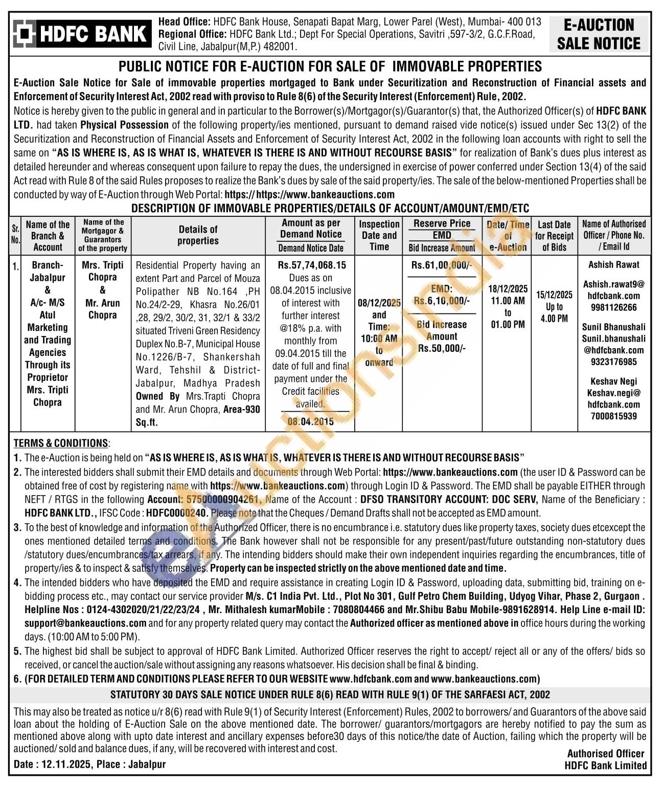 Residential Property having an extent Part and Parcel of Mouza Polipather NB No.164 PH No.24/2-29, Khasra No.26/01 28, 29/2, 30/2, 31, 32/1 & 33/2 situated Triveni Green Residency Duplex No.B-7, Municipal House No.1226/B-7, Shankershah Ward, Tehshil & District-Jabalpur, Madhya Pradesh Owned By Mrs. Trapti Chopra and Mr. Arun Chopra, Area-930 Sq.ft.