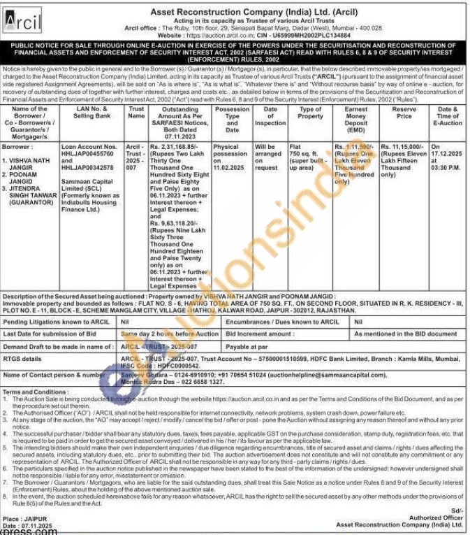 FLAT NO. S-6, HAVING TOTAL AREA OF 750 SQ. FT., ON SECOND FLOOR, SITUATED IN R. K. RESIDENCY-III PLOT NO.E-11, BLOCK-E, SCHEME MANGLAM CITY, VILLAGE-HATHOJ, KALWAR ROAD, JAIPUR-302012, RAJASTHAN