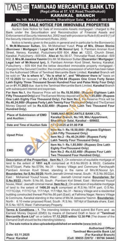 Description of the Properties: Item No.1: On extension of equitable mortgage of land to the extent of 1851 sq.ft comprised at R.S.No.96/20 & 95/22, Cadastre No.673/part, Patta No.575N, No.31 Neravy Village and Commune Panchayath Pambani Amman Kovil Street, standing in the name of Mrs. M.Noorul lyn. Boundaries: for S.No.95/20: North. Jeenath Ummal manai, South: R.S.No.95/22pt, East: Mohamed Yousuf house, West: Jeenath Ummal manai. Boundaries: for S.No.95/22: North: S. No. 95, South Pambani Kol Street, East: Mohamed Yousuf house, West: Jeenath Ummal manal.