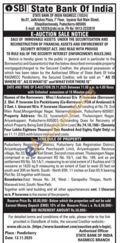 Puducherry Registration District, Puducherry Sub Registration District, Ariyankuppam commune Panchayath Limit, Ariyankuppam Revenue village, No.33, Iyyanar Koil Street, Second cross street, Thulasingam Nagar, comprised in as per document RS No. 55/1, cad No. 188, and as per settlement RS No. 55/1A/1, measuring to an total extent of 2 Kuzhies and 13 veesams or 1620 sq.ft measuring to an extent of East to west 20 feet on south and 30ft on North, South-North 65ft. 11 inches on East 65 ft bearing Plot No. 33 together with house.Boundaries:East: House No. 34, West Ganapathy Thoppu, North Manaveli limit, South: New Path. Together with land building and all other appurtenances smt. I Umarani w/o. P Isvarane is the owner of the property.