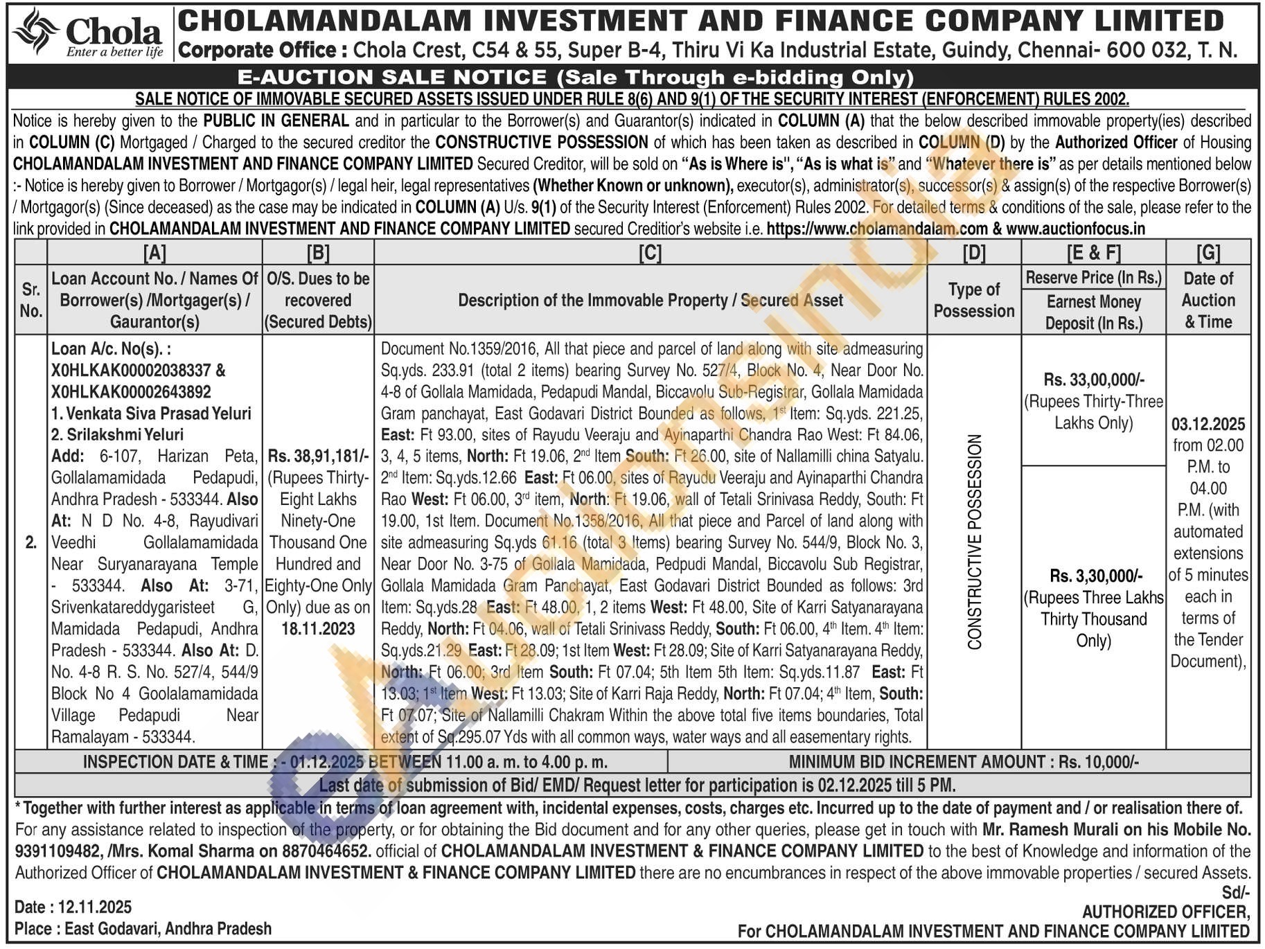 Document No.1359/2016, All that piece and parcel of land along with site admeasuring Sq.yds. 233.91 (total 2 items) bearing Survey No. 527/4, Block No. 4, Near Door No. 4-8 of Gollala Mamidada, Pedapudi Mandal, Biccavolu Sub-Registrar, Gollala Mamidada Gram panchayat, East Godavari District Bounded as follows, 1" Item: Sq.yds. 221.25, East: Ft 93.00, sites of Rayudu Veeraju and Ayinaparthi Chandra Rao West: Ft 84.06, 3, 4, 5 items, North: Ft 19.06, 2d Item South: Ft 26.00, site of Nallamilli china Satyalu. 2d Item: Sq.yds. 12.66 East: Ft 06.00, sites of Rayudu Veeraju and Ayinaparthi Chandra Rao West: Ft 06.00, 3rd item, North: Ft 19.06, wall of Tetali Srinivasa Reddy, South: Ft 19.00, 1st Item. Document No.1358/2016, All that piece and Parcel of land along with site admeasuring Sq.yds 61.16 (total 3 Items) bearing Survey No. 544/9, Block No. 3, Near Door No. 3-75 of Gollala Mamidada, Pedpudi Mandal, Biccavolu Sub Registrar, Gollala Mamidada Gram Panchayat, East Godavari District Bounded as follows: 3rd Item: Sq.yds.28 East: Ft 48.00, 1, 2 items West: Ft 48.00, Site of Karri Satyanarayana Reddy, North: Ft 04.06, wall of Tetali Srinivass Reddy, South: Ft 06.00, 4th Item. 4th Item: Sq.yds.21.29 East: Ft 28.09; 1st Itern West: Ft 28.09; Site of Karri Satyanarayana Reddy, North: Ft 06.00; 3rd Item South: Ft 07.04; 5th Item 5th Item: Sq.yds.11.87 East: Ft 13.03; 1 Item West: Ft 13.03; Site of Karri Raja Reddy, North: Ft 07.04; 4 Item, South: Ft 07.07; Site of Nallamilli Chakram Within the above total five items boundaries, Total extent of Sq.295.07 Yds with all common ways, water ways and all easementary rights.