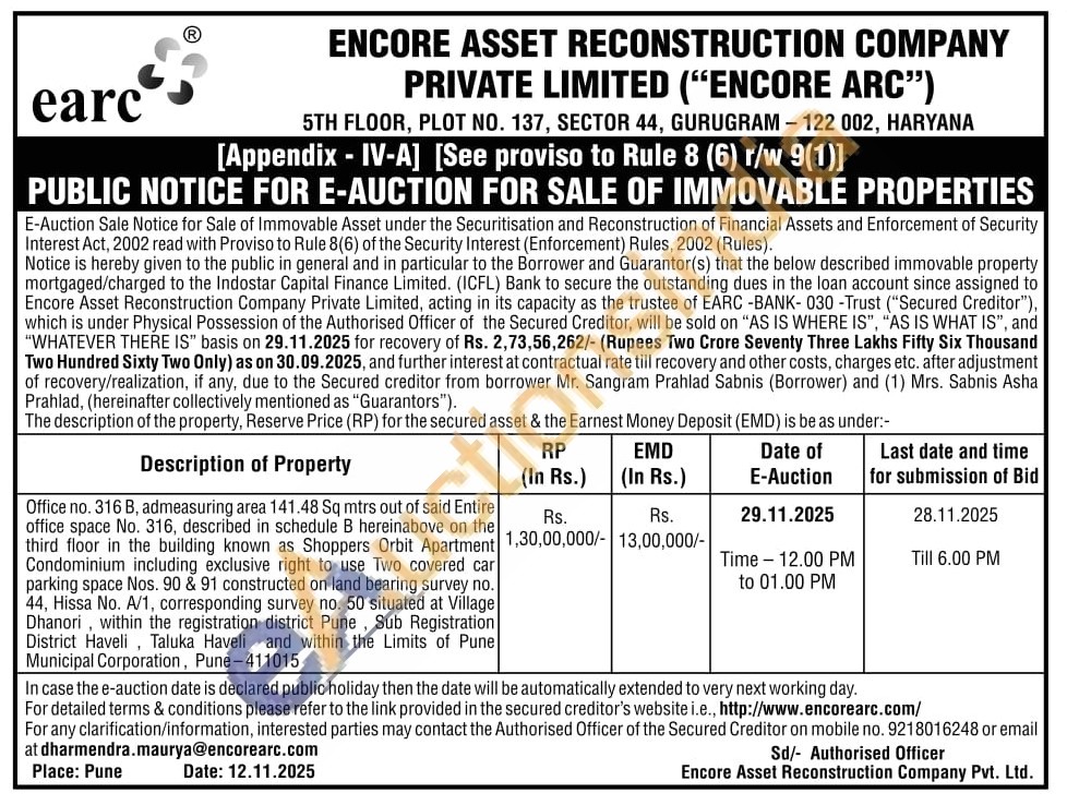 Office no. 316 B, admeasuring area 141.48 Sq mtrs out of said Entire office space No. 316, described in schedule B hereinabove on the third floor in the building known as Shoppers Orbit Apartment Condominium including exclusive right to use Two covered car parking space Nos. 90 & 91 constructed on land bearing survey no. 44, Hissa No. A/1, corresponding survey no. 50 situated at Village Dhanori, within the registration district Pune, Sub Registration District Haveli, Taluka Haveli and within the Limits of Pune Municipal Corporation, Pune-411015