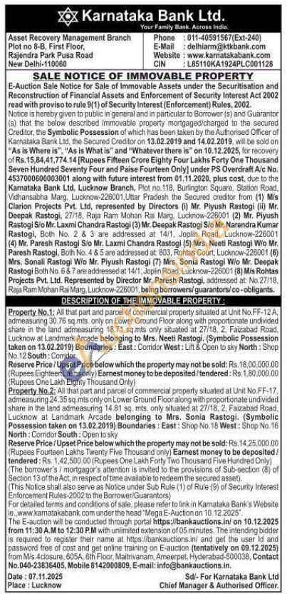 Property No.2: All that part and parcel of commercial property situated at Unit No.FF-17, admeasuring 24.35 sq.mts only on Lower Ground Floor along with proportionate undivided share in the land admeasuring 14.81 sq. mts, only situated at 27/18, 2, Faizabad Road, Lucknow at Landmark Arcade belonging to Mrs. Sonia Rastogi. (Symbolic Possession taken on 13.02.2019) Boundaries: East: Shop No. 18 West: Shop No.16 North: Corridor South: Open to sky