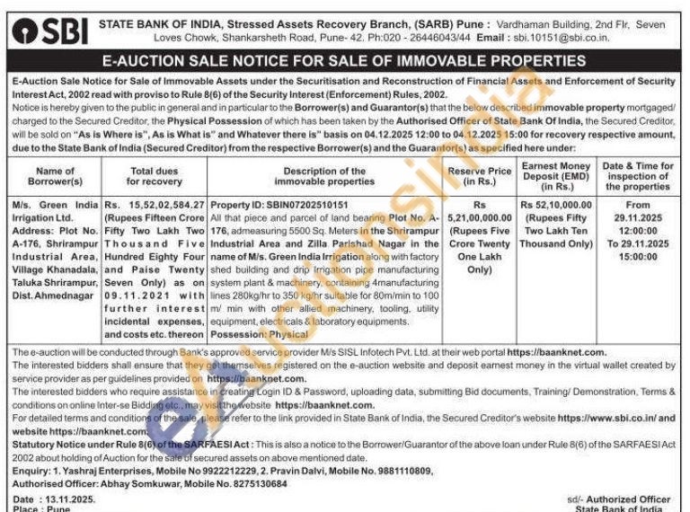 All that piece and parcel of land bearing Plot No. A-176, admeasuring 5500 Sq. Meters in the Shrirampur Industrial Area and Zilla Parishad Nagar in the name of M/s. Green India Irrigation along with factory shed building and drip Irrigation pipe manufacturing system plant & machinery, containing 4manufacturing lines 280kg/hr to 350 kg/hr suitable for 80m/min to 100 m/min with other allied machinery, tooling, utility equipment, electricals & laboratory equipments.