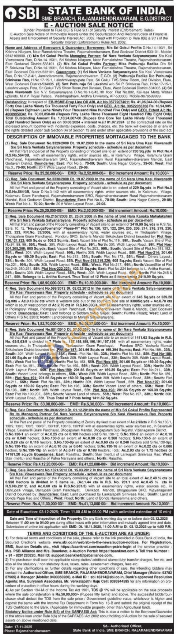 All that Part and parcel of the Property consisting of Vacant site to an extent of 229 Sq.yds in Plot No.5 R.S.No.564/38, Near D.No.3-142 with all easementary rights, water sources etc., in Kolamuru Village, Kolamuru Gram Panchayat, Rajamahendravaram SRO, Rajamahendravaram Rural Rajamahendravaram Mandal, East Godavari District. Boundaries: East: Plot No.6., 70-00; South: Uma Nagar Colony., 29-05; West: Plot No.4., 70-00; North: 20 ft Wide Layout Road., 29-05.