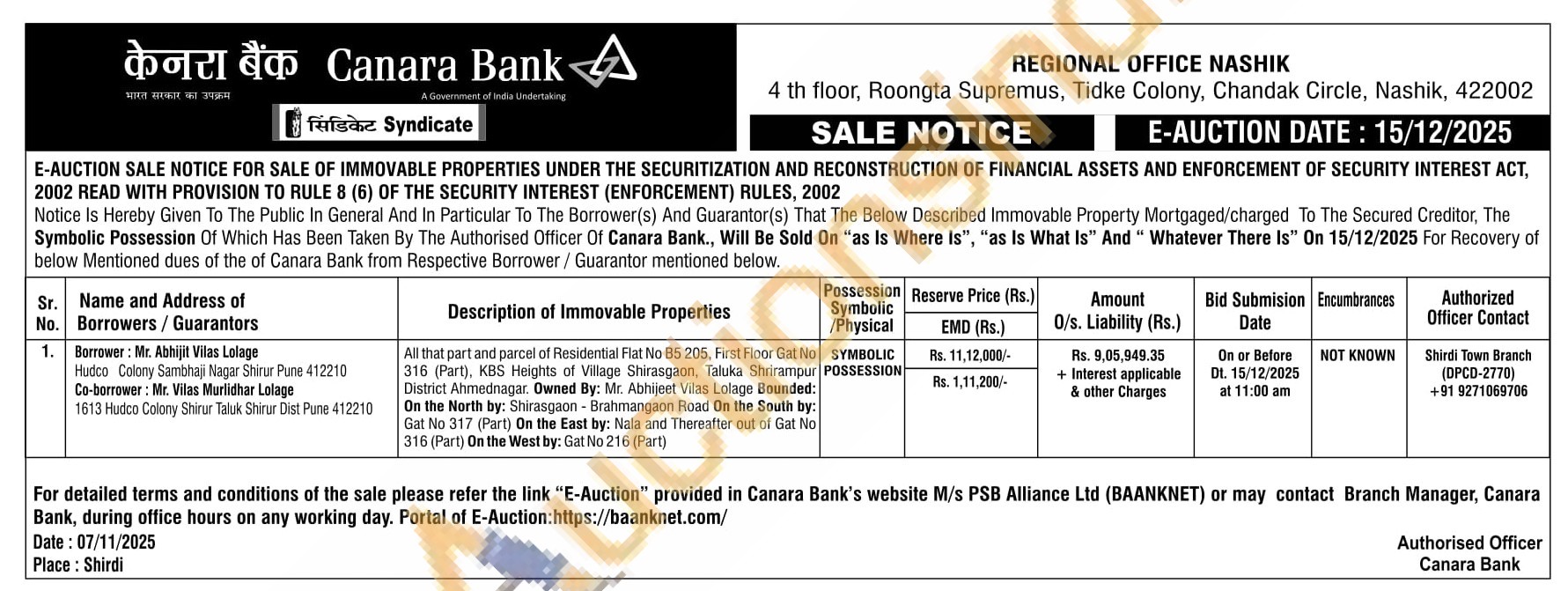 All that part and parcel of Residential Flat No B5 205, First Floor Gat No 316 (Part), KBS Heights of Village Shirasgaon, Taluka Shrirampur District Ahmednagar. Owned By: Mr. Abhijeet Vilas Lolage Bounded: On the North by: Shirasgaon - Brahmangaon Road On the South by: Gat No 317 (Part) On the East by: Nala and Thereafter out of Gat No 316 (Part) On the West by: Gat No 216 (Part)