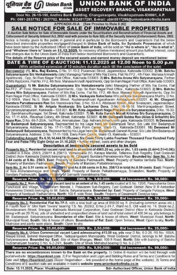 Property No.3: Residential Flat No.TF-5, with a total built up area of 850.00 sq. ft. (Including common areas etc.), in Fourth floor in Shri Ram Towers" bearing TS. No. 2029/2, D.No.2-31-7, Ward no 5, Old ward no. 14, Block no 2, Brundavanam Street, Srinagar, Kakinada Municipal Corporation, East Godavari District (Now in Kakinada District) along with an 20.76 sq. yds of undivided and unspecified share of land out of total extent of 406.94 sq yds belongs to Mr. Badampudi Satyanarayana. Boundaries of site: East: Site & house of others, West: Municipal Road, North: Municipal Road, South: Site & house of others. Boundaries of flat: East: Open Terrace, West: Open to sky, North: Staircase and partly open place, South: Open to sky