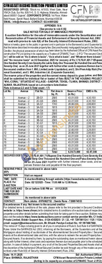 Flat no 3C-G1, Avenue -3 Flat Area 1885 Sq.ft BUILT IN THE HOUSING PROJECT "MVL-CORAL SITUATED AT VILLAGE-SAIDPUR, TEHSIL-TIJARA, BHIWADI, DSITRICT-ALWAR, RAJASTHAN,
