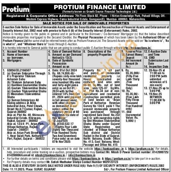 Property No. 1 All part and parcel of immovable residential property i.e House constructed on eastward land area adm 66-80 Sq.Mts. out of land area adm. 125-87 Sq.Mts. agricultural and residential construction permitted plots of land known as "Arjun Park of Kothariya Revenue Survey No 134/4 paiki 1 The present immovable property was purchased through registered Sale Deed No.232 on 8 Cr with ownership rights by Shri Minaben Tilakrambhai Shahu Shahu under Gujarat State Registration and situated at Village Kothariya Sub district and District Rajkot in the State of Gujarat. North: Balcony, South: Office No. 413, East: Balcony, West: Passage and Office No. 415