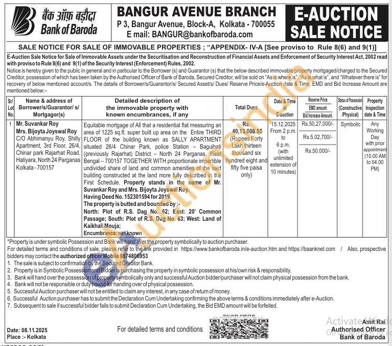 Equitable mortgage of All that a residential flat measuring an area of 1225 sq.ft. super built up area on the Entire THIRD FLOOR of the building known as SALLY APARTMENT situated 26/4 Chinar Park, police Station Baguihati (previously Rajarhat) District North 24 Parganas, West Bengal-700157 TOGETHER WITH proportionate impartible undivided share of land and common amenities of the said building constructed at the land more fully described in the First Schedule.