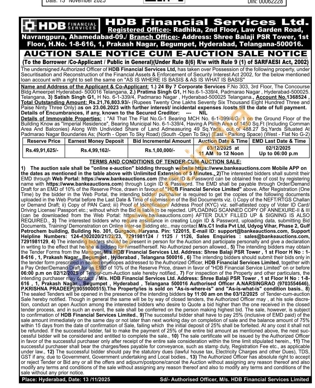 "All That The Flat No.G-1 Bearing MCH No. 6-1-399/4/G-1 on the Ground Floor of the Building Know as "Imperial Residence", Bearing Municipal No. 6-1-339/4, Having A Plinth Area of 1450 Sq.Ft (Including Comman Area And Balconies) Along With Undivided Share of Land Admeasuring 49 Sq. Yads., out of 488.27 Sq. Yards Situated At Padmarao Nagar Boundaries As; (North - Open To Sky Road) (South-Open To Sky) (East - Parking Space) (West - Flat No G-2)