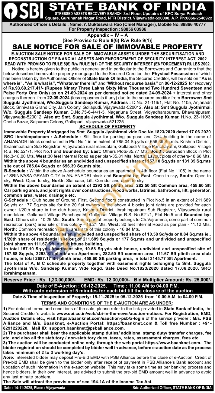 A-Schedule: Stilt floor for parking purpose and G+4 building in the name of ANJANADRI block constructed in Plot No.1 in an extent of 785.04 Sq.yds or 656.39 Sq.mts. Krishna District, Ibrahimpatnam Sub Registrar, Vijayawada rural mandalam, Gollapudi Village Panchayathi, Gollapudi Village R.S. No.521/1, Plot No.1 and Bounded by: East: Others Plots-35.77 Mts, South: Garudadri Block in Plot No.3-18.00 Mts, West:30 feet Internal Road as per plan-35.81 Mts, North: Layout plots of others-18.68 Mts. Within the above 4 boundaries an undivided and unspecified share of 157.10 Sq.yds or 131.35 Sq.mts site out of 785.04 Sq.yds or 656.39 Sq.mts site. B-Scedule: Within the above A-schedule boundaries an apartment in 4th floor (Flat No 1105) in the name of SRINIVASA GRAND CITY in ANJANADRI block and Bounded by: East: Open to sky, South: Open to sky, West: Open to sky, North: Staircase, Lift, Corridor and open to sky. Within the above boundaries an extent of 2293 Sft plinth area, 282.50 Sft Common area, 458.60 Sft Car parking area, and joint rights over constructions, wood works, latrines, bathrooms, lift, generator, common area, water, drainage etc. C-Schedule: Club house of Ground, First, Second floors constructed in Plot No.5 in an extent of 211.689 Sq.yds or 177 Sq.mts site for the 20 flat owners in the above 4 blocks joint rights are provided for each owner 1/20th share in the club house, Krishna District, Ibrahimpatnam Sub Registrar, Vijayawada rural mandalam, Gollapudi Village Panchayathi, Gollapudi Village R.S. No.521/1, Plot No.5 and Bounded by: East: Others site 10.29 Mts, South: Some part of property belongs to Ch. Vajramma, some part of common. recreation (park) area site of this colony 16.21 Mts, West: 30 feet Internal Road as per plan 11.12 Mts, North: Common recreation (park) area site of this colony 16.84 Mts