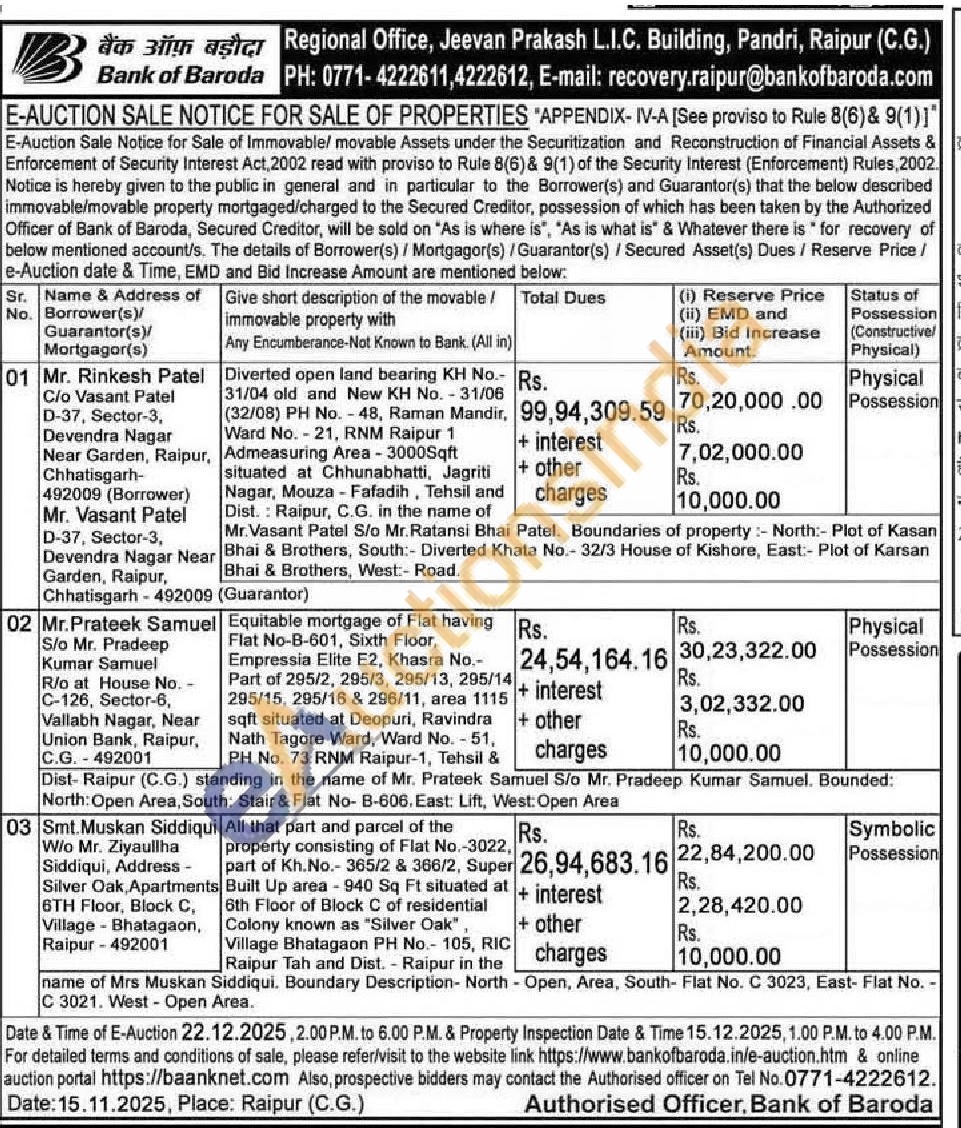 Diverted open land bearing KH No.-31/04 old and New KH No. - 31/06 (32/08) PH No.-48, Raman Mandir, Ward No.21, RNM Raipur 1 Admeasuring Area - 3000Sqft situated at Chhunabhatti, Jagriti Nagar, Mouza-Fafadih, Tehsil and Dist. Raipur, C.G. in the name of Bhai & Brothers, West:- Road. Mr.Vasant Patel S/o Mr. Ratansi Bhai Patel. Boundaries of property: North:- Plot of Kasan Bhai & Brothers, South:- Diverted Khata No.- 32/3 House of Kishore, East:- Plot of Karsan