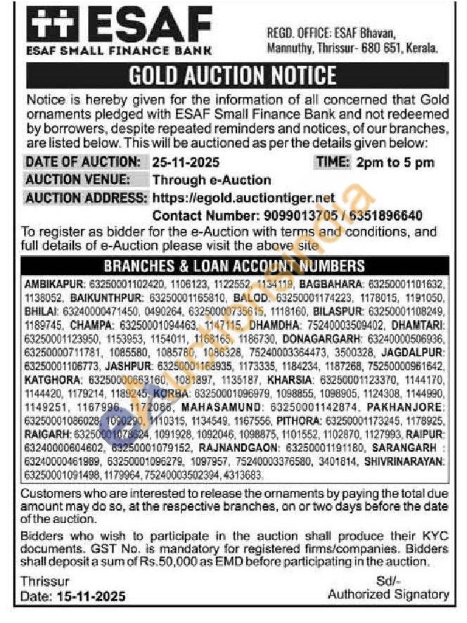 ESAF SMALL FINANCE BANK Gold Auctions Auction in Thrissur