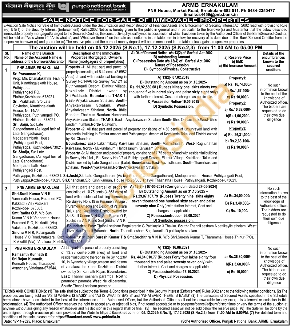 All that part and parcel of property consisting of 10.75 cents (4.353 Ares) of land with residential building thereon in Re Survey No.7/19 in Purameri Village, Purameri Amsom and Desom of Vatakara Taluk and Kozhikode District owned by Sri.Sunil Kumar VN K, Smt.Radha O P. Suchithra VN K and Smt Sindhu VN K.Boundaries: East: Thannil sesham Bagakararile G Pattikayile 3 Thakku. South: Thannil sesham A pattikayile sthalam. West: Kizhakke Thottoli Paramba. North: Thannil sesham Bagakararile D pattikayile sthalam.