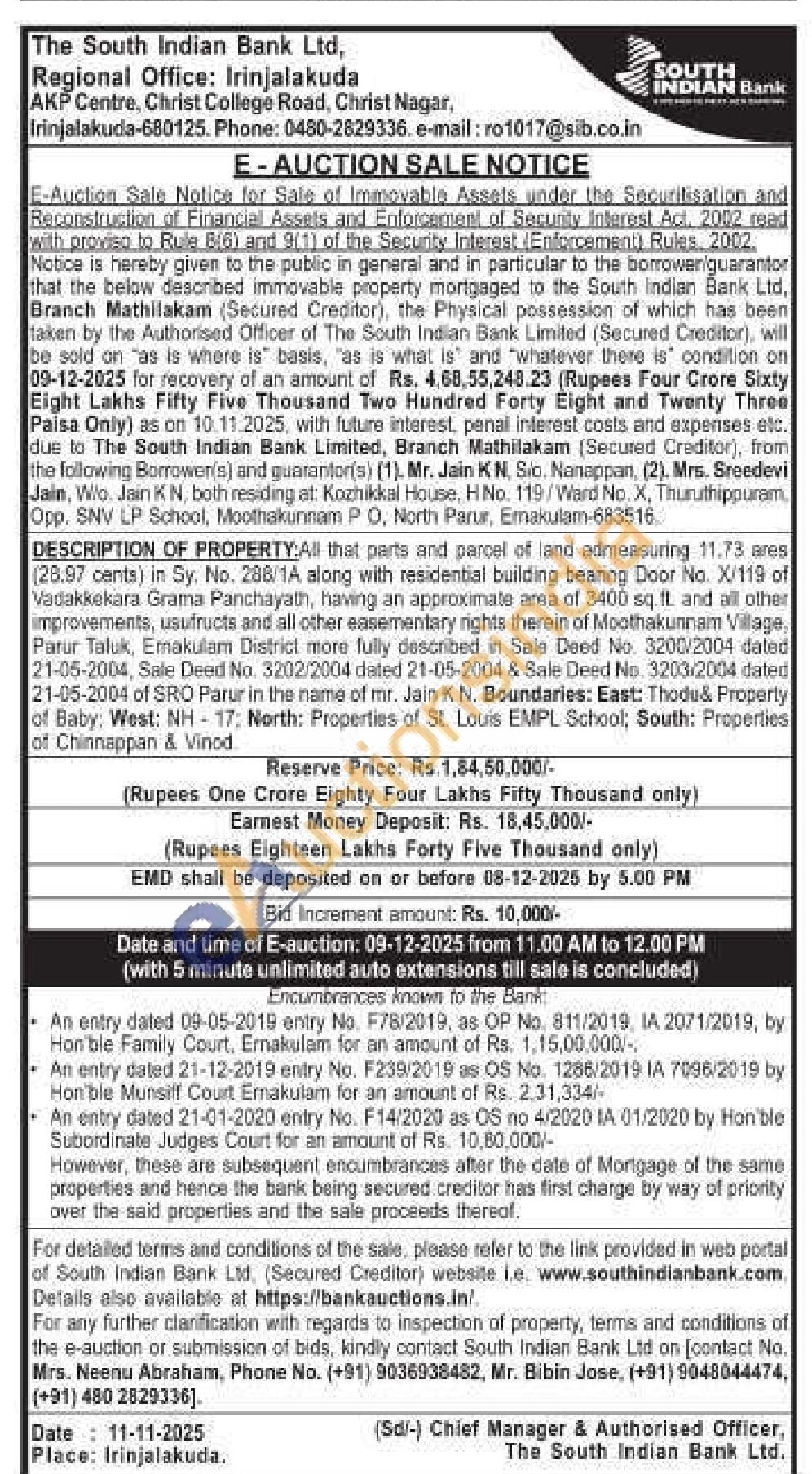 PROPERTY:All that parts and parcel of land admeasuring 11.73 ares (28.97 cants) in Sy. No. 288/1A along with residential building bearing Door No. X/119 of Vadakkekara Grama Panchayath, having an approximate area of 3400 sq ft and all other improvements, usufructs and all other easementary rights therein of Moothakunnam Village, Parur Taluk, Ernakulam District more fully described in Sale Deed No. 3200/2004 dated 21-05-2004, Sale Deed No. 3202/2004 dated 21-05-2004 & Sale Deed No. 3203/2004 dated 21-05-2004 of SRO Parur in the name of mr. Jain K.N. Boundaries: East: Thodu& Property of Baby West: NH-17: North: Properties of St. Louis EMPL School; South: Properties of Chinnappan & Vinod