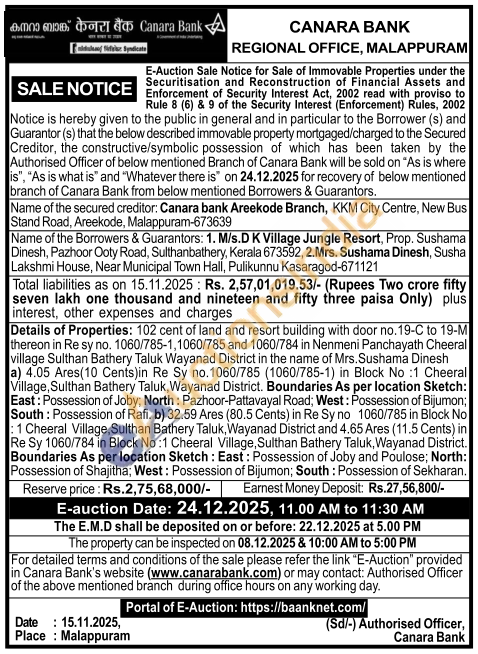 Details of Properties: 102 cent of land and resort building with door no. 19-C to 19-M thereon in Re sy no. 1060/785-1,1060/785 and 1060/784 in Nenmeni Panchayath Cheeral village Sulthan Bathery Taluk Wayanad District in the name of Mrs. Sushama Dinesh a) 4.05 Ares (10 Cents)in Re Sy no.1060/785 (1060/785-1) in Block No:1 Cheeral Village, Sulthan Bathery Taluk, Wayanad District. Boundaries As per location Sketch: East: Possession of Joby; North: Pazhoor-Pattavayal Road; West: Possession of Bijumon; South: Possession of Rafi. b) 32.59 Ares (80.5 Cents) in Re Sy no 1060/785 in Block No 1 Cheeral Village, Sulthan Bathery Taluk, Wayanad District and 4.65 Ares (11.5 Cents) in Re Sy 1060/784 in Block No:1 Cheeral Village, Sulthan Bathery Taluk, Wayanad District. Boundaries As per location Sketch: East: Possession of Joby and Poulose; North: Possession of Shajitha; West: Possession of Bijumon; South: Possession of Sekharan
