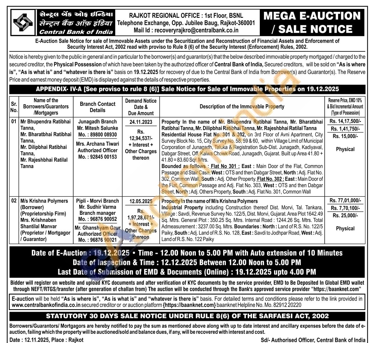 Property In the name of Mr. Bhupendra Ratibhai Tanna, Mr. Bharatbhai Ratibhai Tanna, Mr. Dilipbhai Ratibhai Tanna, Mr. Rajeshbhai Ratilal TannaResidential House Flat No. 301 & 302, on 3rd Floor of Avni Apartment, City Survey Block No. 15, City Survey No. 58, 59 & 60, within Village Limit of Municipal Corporation of Junagadh, Taluka & Registration Sub-Dist. Junagadh, Kadiyaval, Dabgar Street, Off. Kalwa Chowk Road, Junagadh, Gujarat. Built up Area 41.80+ 41.80-83.60 Sqr. Mtrs.Bounded as follows: Flat No 301: East: Main Door of the Flat, Common Passage and Stair Case, West: OTS and then Dabgar Street, North: Adj. Flat No. 302, Common Wall, South: Adj. Other Property. Flat No. 302: East: Main Door of the Flat, Common Passage and Adj. Flat No. 303, West: OTS and then Dabgar Street, North: Adj. Others Property, South: Adj. Flat No. 301, Common Wall